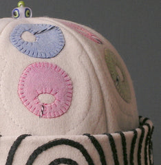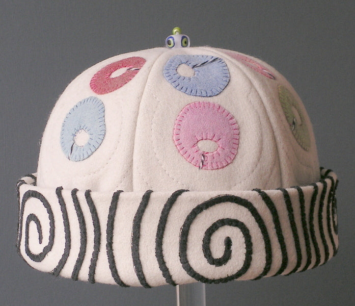 Here’s a whimsical white hat with pink & blue highlights, accented with a black swirl on the brim. Here’s a hat that says, you’re looking for fun and staying warm at the same time.